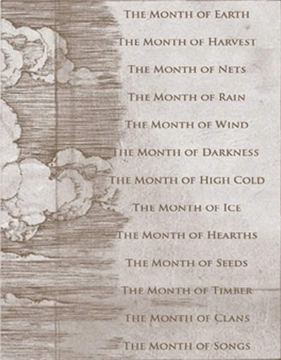 - Известно по крайней мере три сезона года, которые соответствуют сезонам реального мира. Сезон зимы включает в себя Месяцы тьмы, холода и льда. Месяцы жатвы и сетей приходятся на лето Империи, а Месяц ветра - на осень.