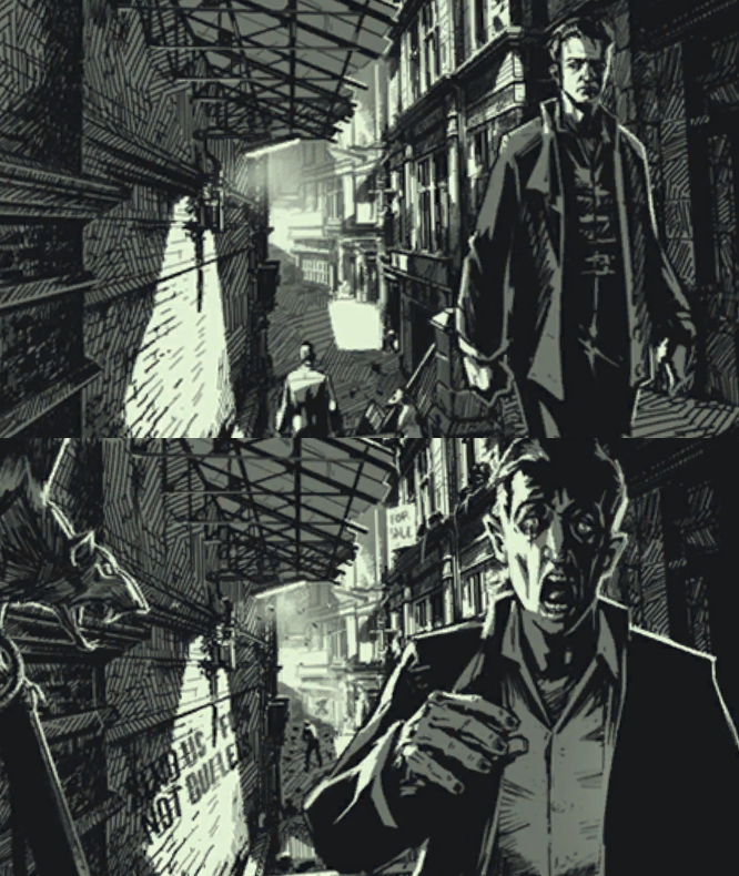An illustration of Dunwall in low and high chaos.
