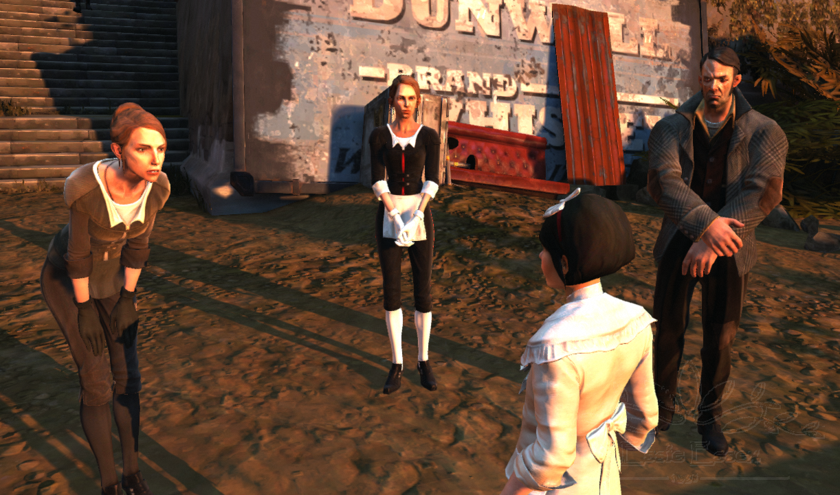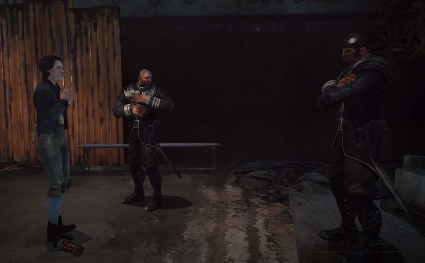 Corvo, Samuel, and Emily arrive at the Hound Pits to find Callista, Lydia, and Wallace waiting for them by the edge of the river. Wallace can be seen running towards the stairs and then calling out for the maids. Corvo helps Emily from the boat, and Callista welcomes her. After Emily goes to her room with Callista, Havelock congratulates Corvo on a job well done.