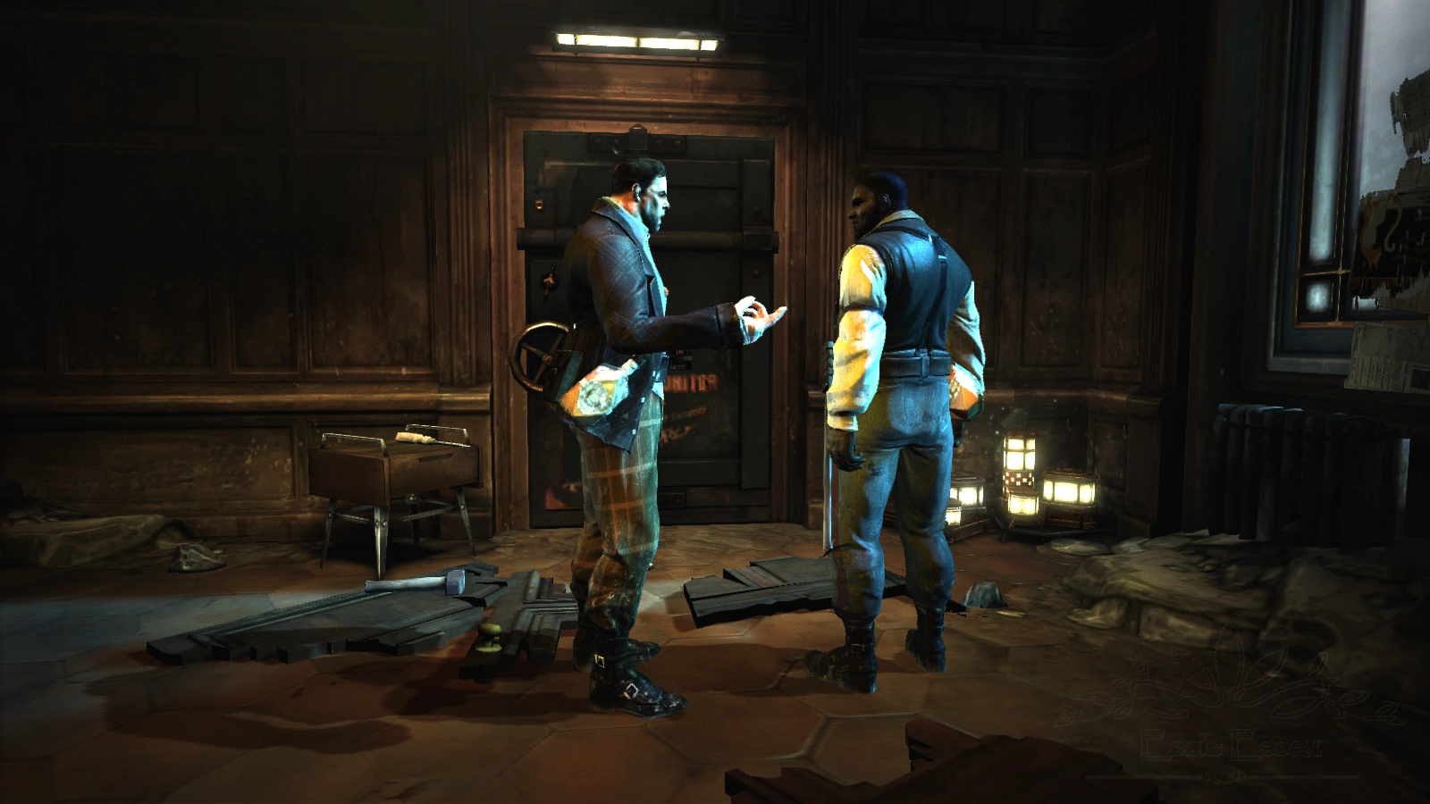 On the third floor is the safe, in front of which are Stu and another thug attempting to open it. Once again, they are distracted, and Corvo can neutralize them with ease.