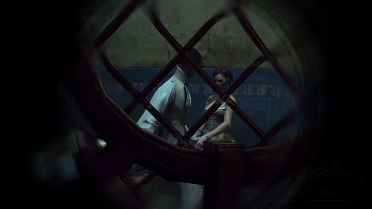 Emily waits for Corvo to unlock the door leading out of the Golden Cat.