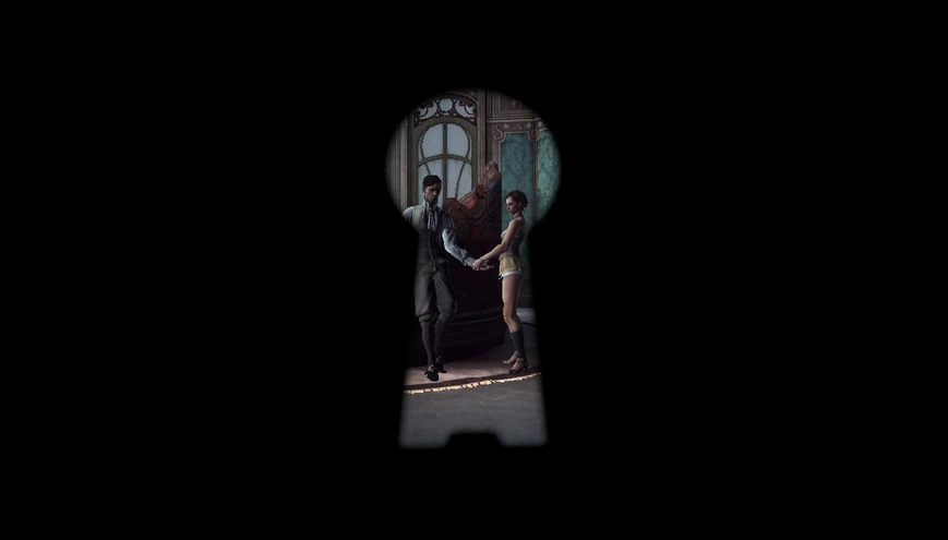 Corvo uses a keyhole to spy on Morgan Pendleton and a courtesan at the Golden Cat.
