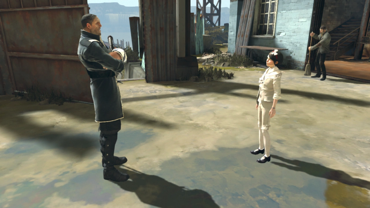 If Corvo continues through the yard - after giving Havelock enough time to get there himself - he will come across the admiral and Emily having a conversation. Emily will ask Havelock about sea battles and pirates, expressing her interest in his stories and explaining that as an empress, she "will have to sink lots of enemy ships [her]self". Havelock answers her questions rather tersely, as though he does not know how to speak to her, but he then tells Emily that his stories are "not for young girls to hear about". Emily will then ask him if there are witches aboard the ships. Havelock obliges her, confirming that there are indeed witches on ships that can control whales and cause storms; however, growing uncomfortable with the conversation topic, he suggests they stop talking.