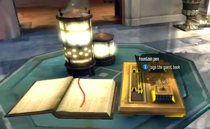 - It is possible for Corvo to sign the guestbook near the door of the mansion's foyer. On interacting with the book and signing his name, it will display "Corvo Attano" at the bottom. This has no effect on actual gameplay; however, one of two notes (depending on whether Lady Boyle was neutralized lethally or non-lethally) will be found in the next mission bringing the matter to Hiram Burrows' attention.