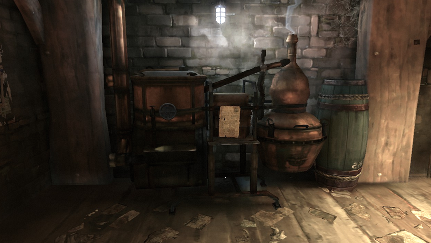 蒸馏器是个极其稀有的器具,游戏主线中只有两个地方可见:顿沃威士忌酿酒厂的松颚办公室和考德温大桥索科洛夫的安全屋里。将空的万能药水瓶放置在药口后启动蒸馏器,科尔沃·阿塔诺(Corvo Attano)就可以获得免费的万能药。在两台蒸馏器的周围都可以找到一些空的药水瓶。可惜的是,科尔沃不能重复使用万能药水瓶。