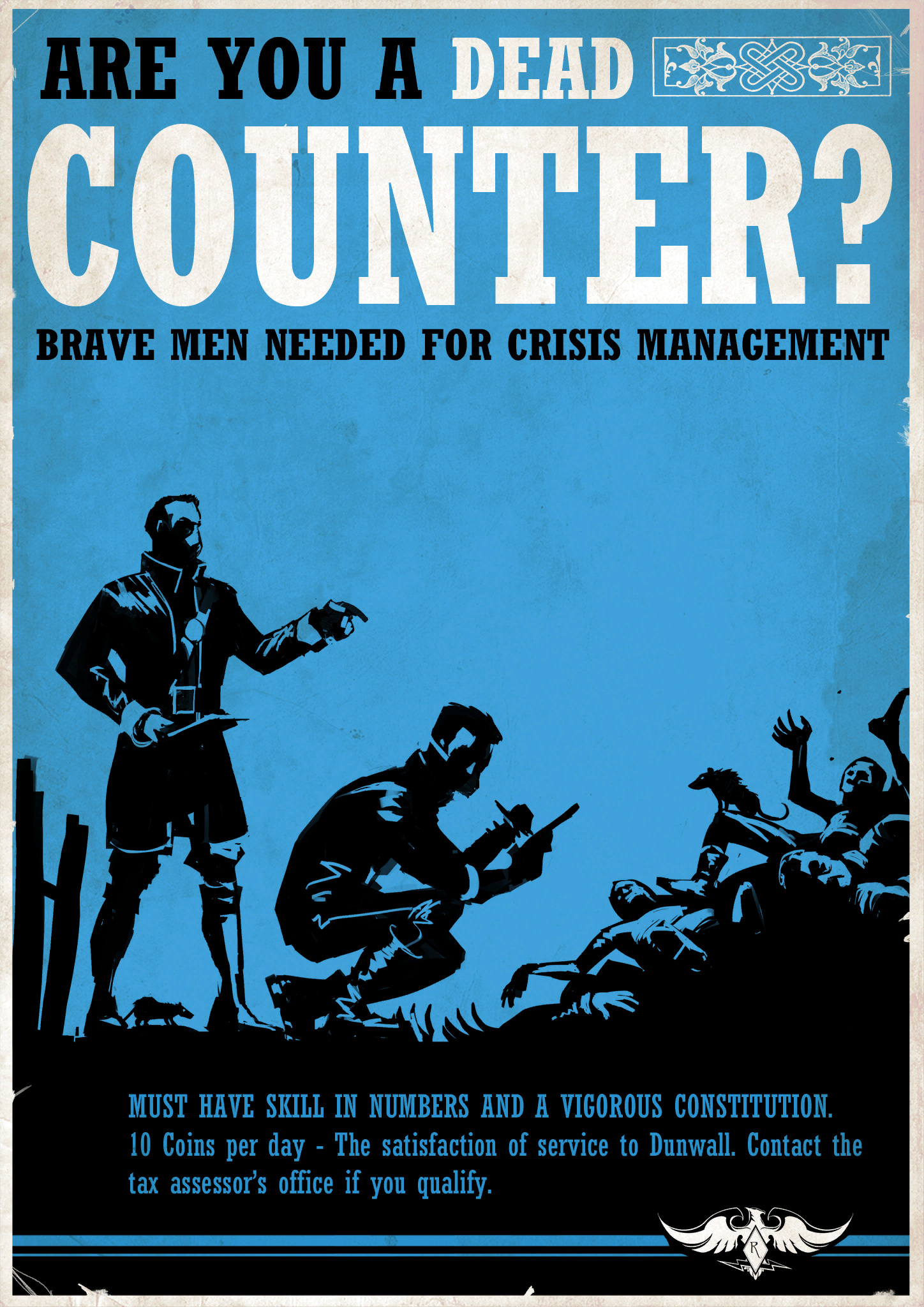 摄政王海勒姆·伯罗斯委任的这个职位,从1837年的雨之月开始。这个位置对城市守卫官公开招募,工资会有所提升,一天10个金币,是通常一个城市守卫官的一倍半(突然觉得酒馆里动不动就6个金币15金币的东西好贵)[1]。这个职位同时还提供额外的万能药来保证他们不会感染文艺。在应征的时候军官必须参加一个测试,如果被选中,会有两周带薪的训练。比起城市守卫的其他成员,死亡验收官对于处理瘟疫这一问题上有更高一级的指挥权,但是其他问题他们必须报告给命令官[2]。