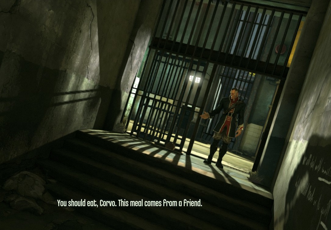 进入下水道后不久,就可以找到一张字条,这张字条旁边是一道上锁的铁门,拦住了科尔沃的去路。科尔沃需要爬上这道铁门所通往房间的顶上,从上方的狭小空间里爬过去才行。这一过程中下面的房间内会聚集起一群老鼠,还能听到房间另一边的一扇门外有两名守卫正在谈论科尔沃。在他爬到那扇门上方附近的时候,这两名守卫就会打开房门,随后被房间里聚集的老鼠攻击并吃掉。