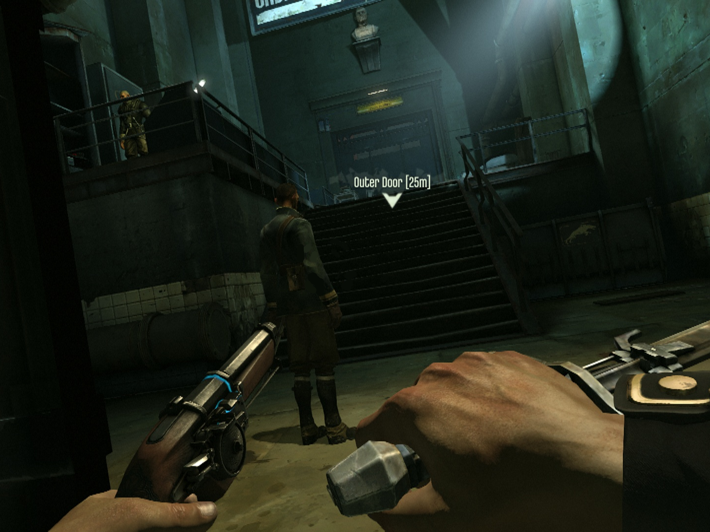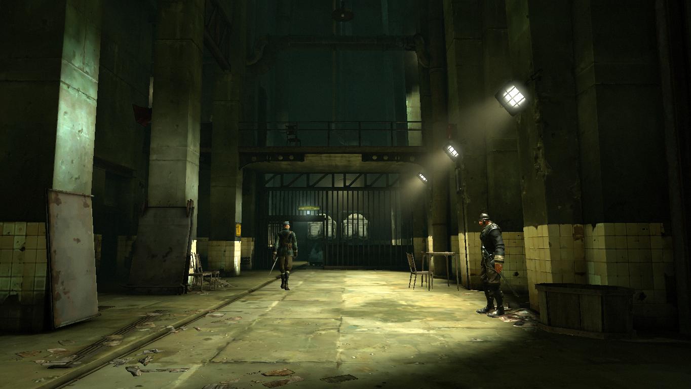 天桥尽头的门是锁着的,科尔沃必须要通过扒窃桥上的一名守卫才能获得钥匙。打开门后,走道会通向一个有另一名守卫巡逻的房间,该房间有两扇门,左边那扇通往审讯室,右边那扇则通往监狱的院子。通往院子的门是暂时上锁的,直到当前目标完成才会打开。为此,科尔沃需要进入审讯室,取得位于房间后面保险箱里的发条炸弹。在审讯室里的桌子上还能找到一份有关审讯科尔沃的报告和一张海勒姆·伯罗斯(Hiram Burrows)记录了对科尔沃审问过程的声谱。