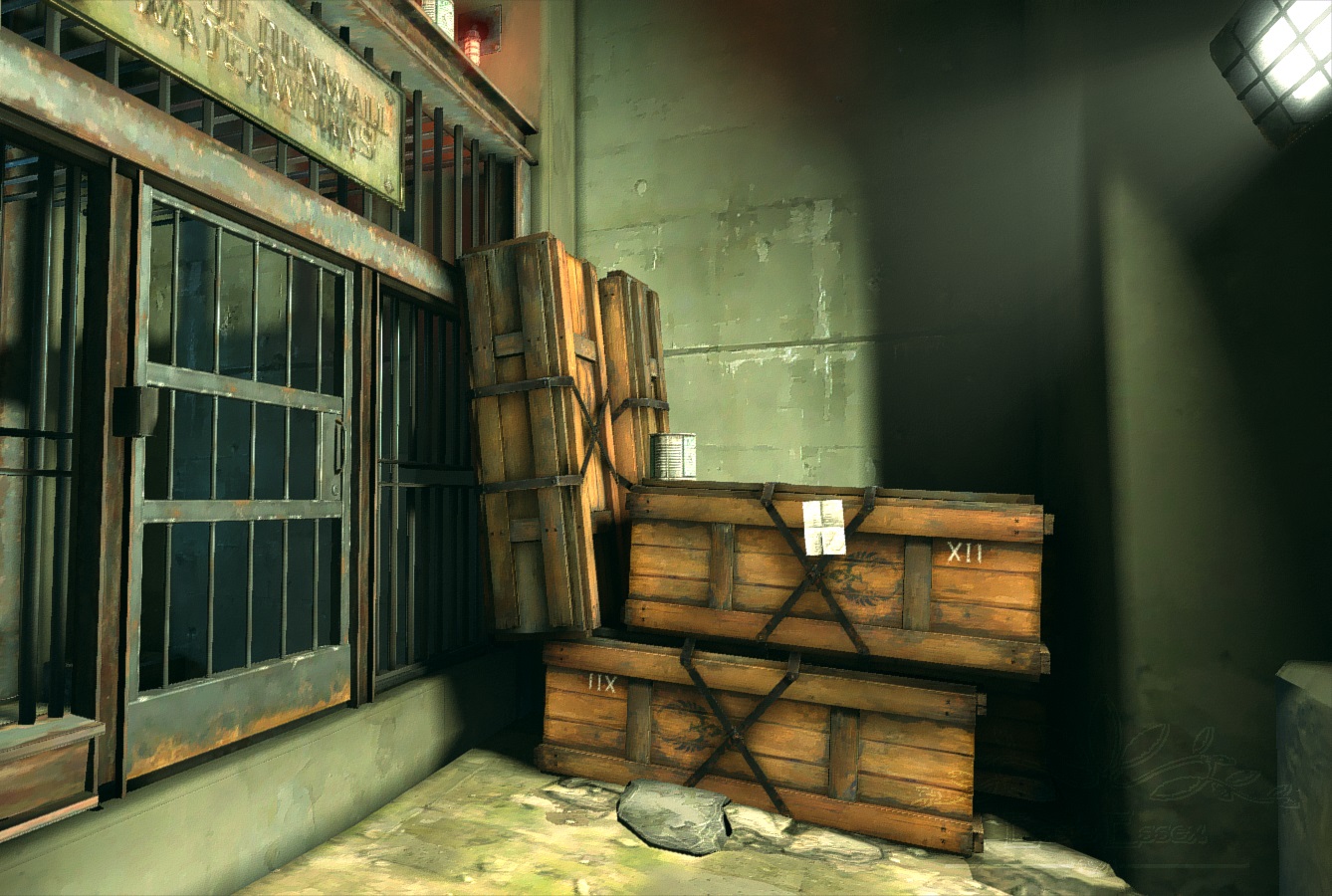 - 在下水道最后那段有守卫巡逻的路途中,存在一个隐士的房间,就藏在一堆木栅栏后面,科尔沃可以打破木栅栏后进入其中。里面有一些可以搜刮的物品和一张字条。科尔沃也可以从上面的管道进入这个房间,出来的话则可以通过攀爬屋里墙边的瓦砾堆实现。这样的话就可以在不破坏木栅栏的情况下进入房间,否则的话可能会引起守卫的注意。