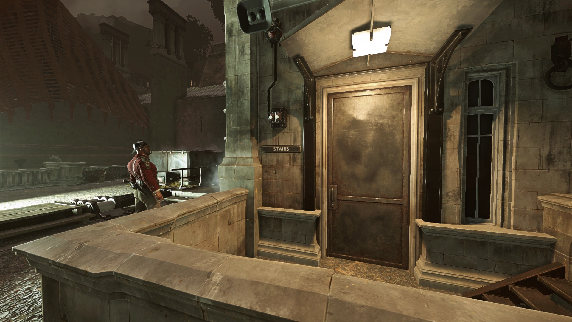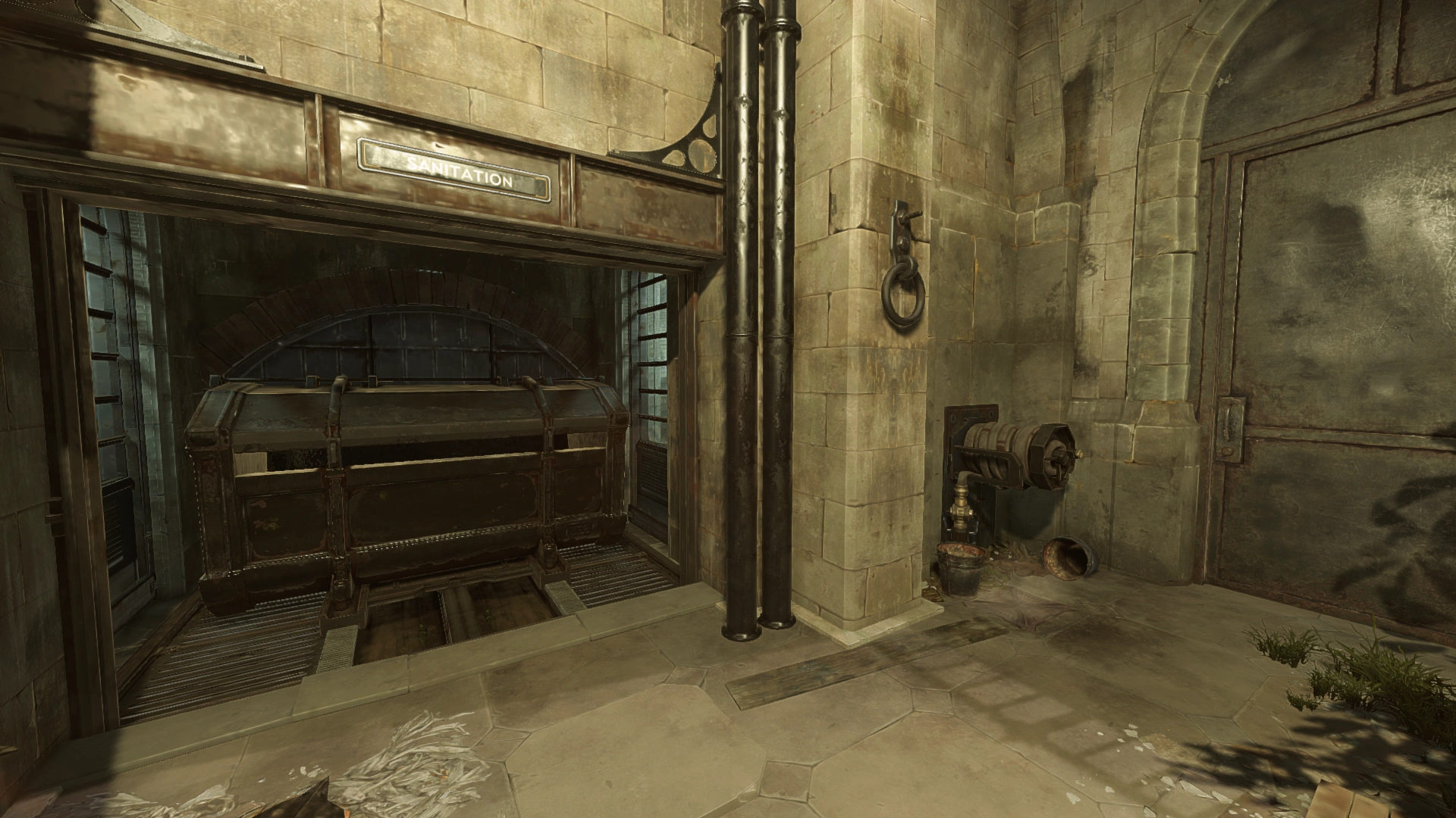 在两个舱门都被打开,里面的曲柄轮被转动后,下水道就被打开了。比莉需要返回拿到扳手的地方,进入下水道溜进银行内部。下水道还有另一道门,其通往电梯的附近。这意味着比莉可以用这种方法轻易运送鲸油罐。