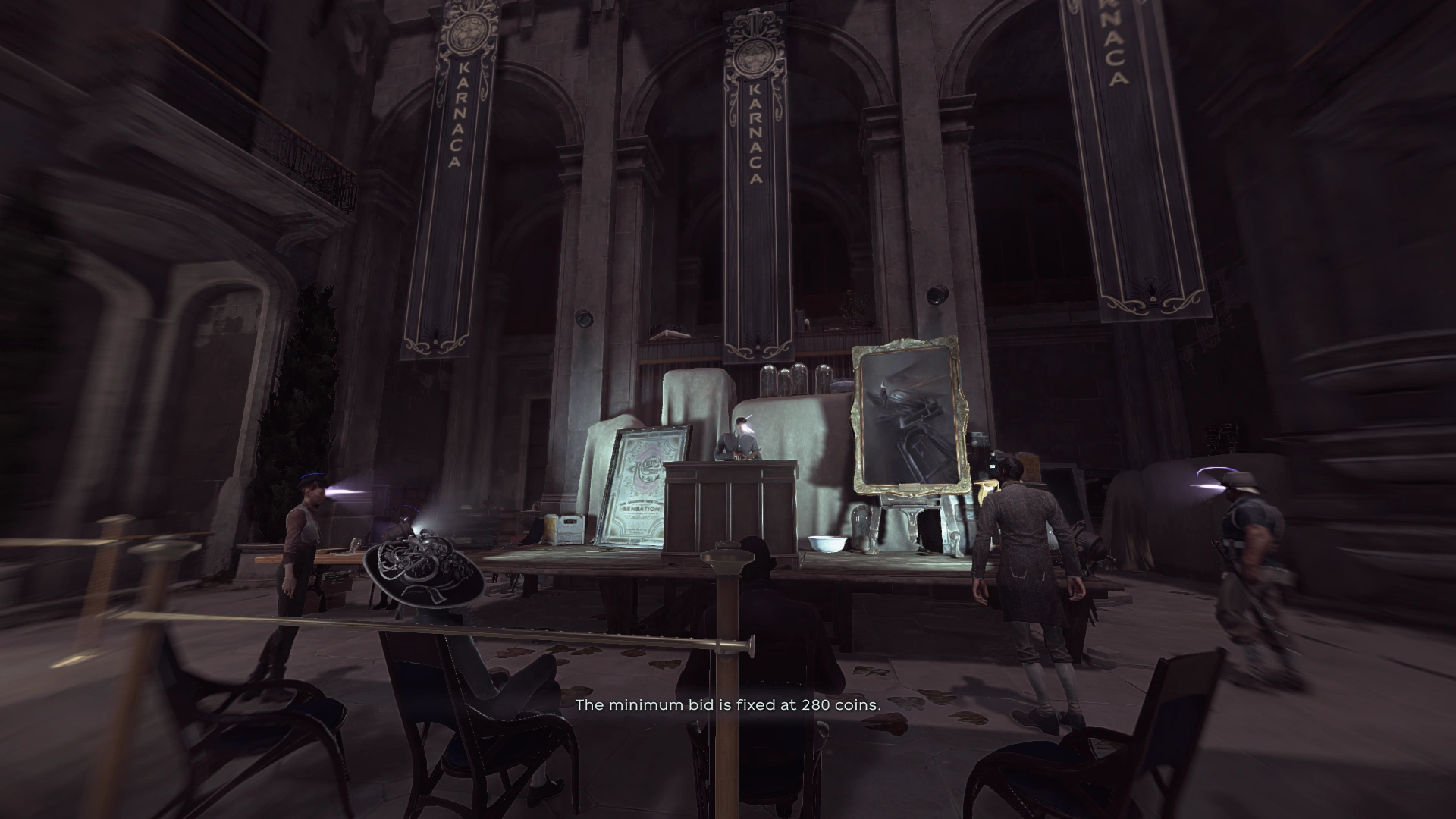 由于拍卖会收到大卫队的保护,比莉必须对人使用“盗貌”才能混进去。比莉需要走到拍卖会的椅子前并参与拍卖会,参加拍卖期间“盗貌”不会消耗虚空之境能量,因此比莉可以放心参加。最终拍卖的价格大概会定在400——500钱币,比莉只需要在关键时刻竞拍就行。鸦片剂也可以在黑市商店买到,但价格是800钱币。在比莉拿到鸦片剂后就可以于银行屋顶的通风系统投放,这会让银行内的所有人都陷入昏迷。